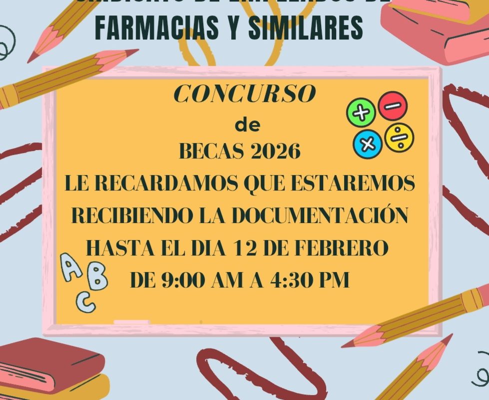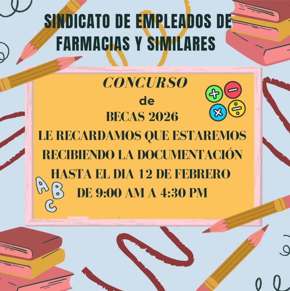Les recordamos a todos los trabajadores (as) de Farmacias Arrocha, Grupo Haseth-Javillo, Laboratorios Rigar, Laboratorios Farmacéuticos y Laboratorios Velrus que hasta el día 12 de febrero estaremos recibiendo la documentación completa para aplicar y poder participar a este Concurso de Becas 2026, si aun no has podido apresúrate y envia tus documentos a nuestra oficina en horario de 9:00 AM a 4:30 PM, e-mail sindsefas27@outlook.com teléfono 221-3971.