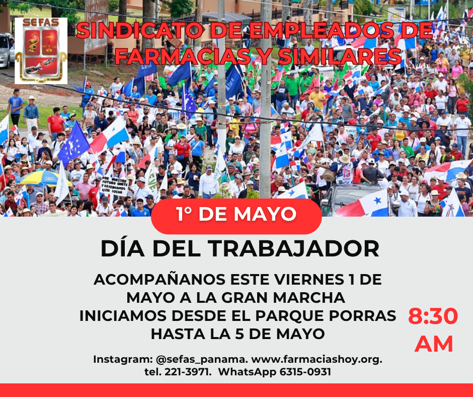 Invitamos a todos los trabajadores de Farmacias y Laboratorios; a que nos acompañen a la marcha este viernes 1 de mayo 2026, en conmemoración a la lucha heroica en Chicago y día del Trabajdor, estaremos a las 8:30 AM en el Parque Belisario PORRAS hacia la 5 de mayo.
