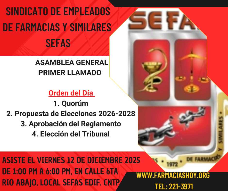 Invitamos a todos los trabajadores (as) de Farmacias y Laboratorios a que participen al Primer Llamado a Asamblea General, la misma se realizará el dia viernes 12 de diciembre 2025 de 1:00 PM a 6:00 PM, en nuestro local SEFAS; edificio CNTP en calle 6ta Río, para cualquier llámanos al 221-3971, Te Esperamos.
