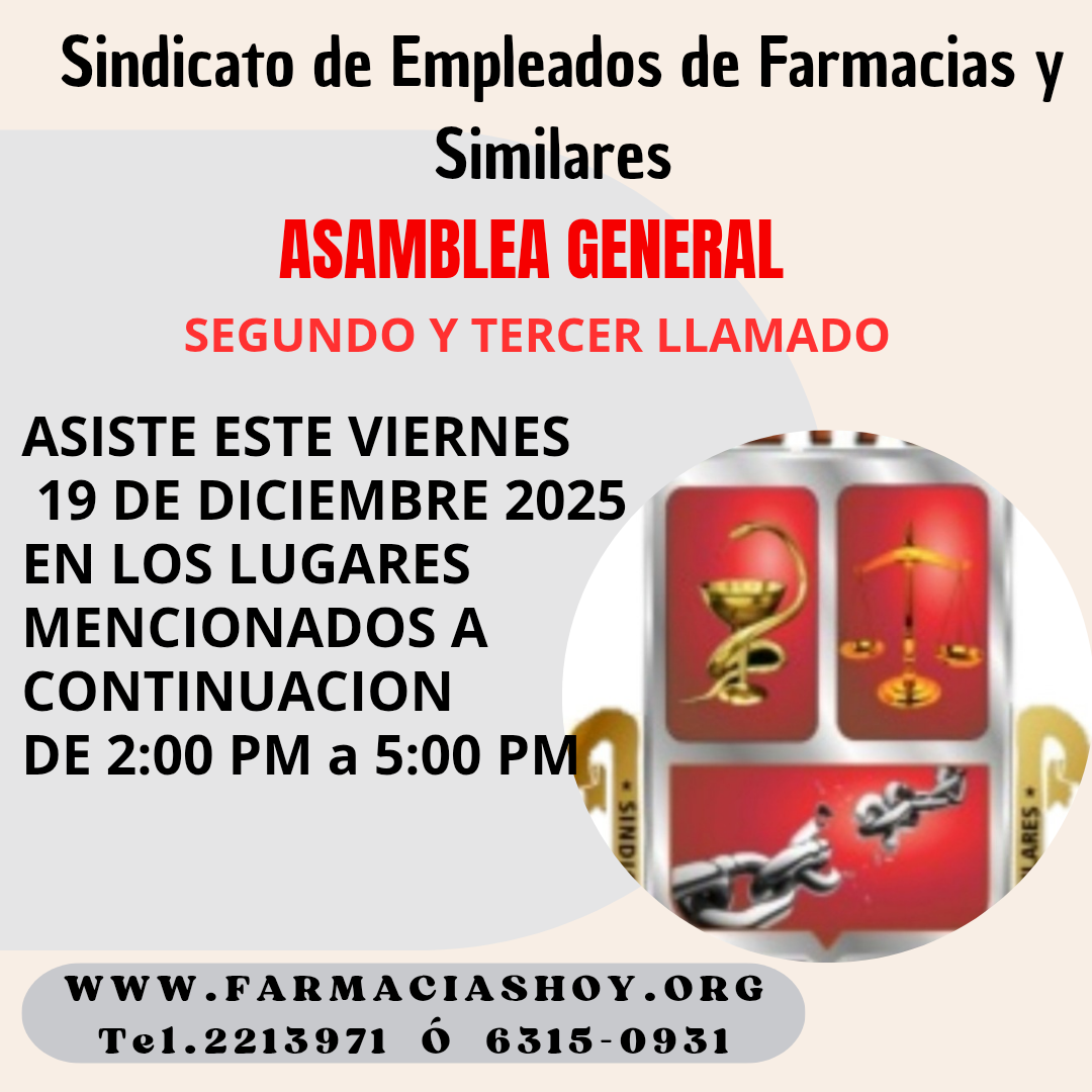 El SEFAS invita a los compañeros (as) de Farmacias y Laboratorios a asistir a Asamblea General; Segundo y Tercer llamado, la misma se realizará el viernes 19 de diciembre 2025; de 2:00 PM a 5:00 PM, en distintas areas a nivel nacional, en la ciudad capital, Panamá Oeste y el interior del País. A continuación mencionaremos los lugares donde se desarrollará esta Asamblea y aprobar el reglamento y la elección del tribunal quienes darán fe y tranparencia de la misma, rumbo a conformar los mienbros para la nueva Junta Directiva 2026 – 2028.