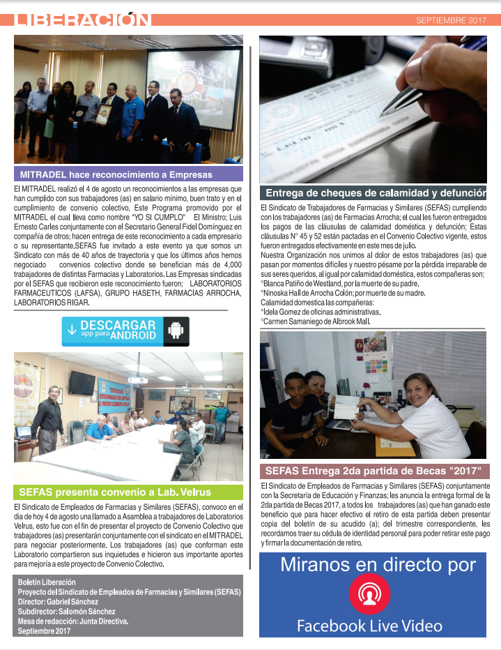 Les anunciamos a todos los trabajadores (as) que ya salió el Boletín «Liberación» edición septiembre; el cual tiene un contenido muy nutrido de todas las actividades y gestión de trabajo que esta realizando la junta directa en los últimos meses.